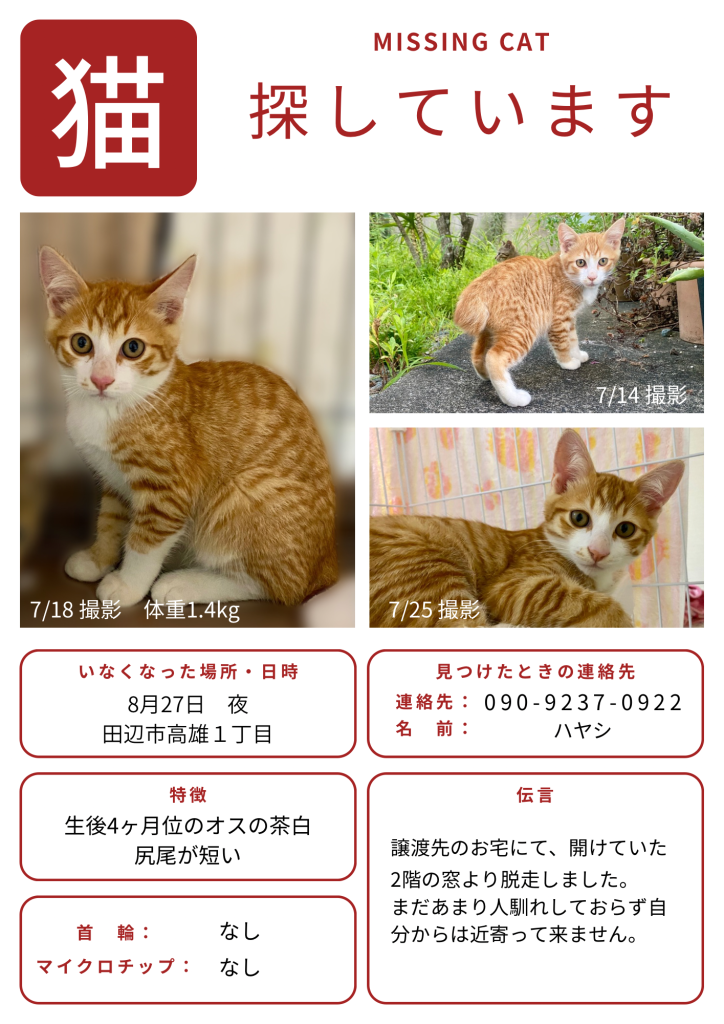 8月27日の夜に 田辺駅の近くのお宅からいなくなったそうです。